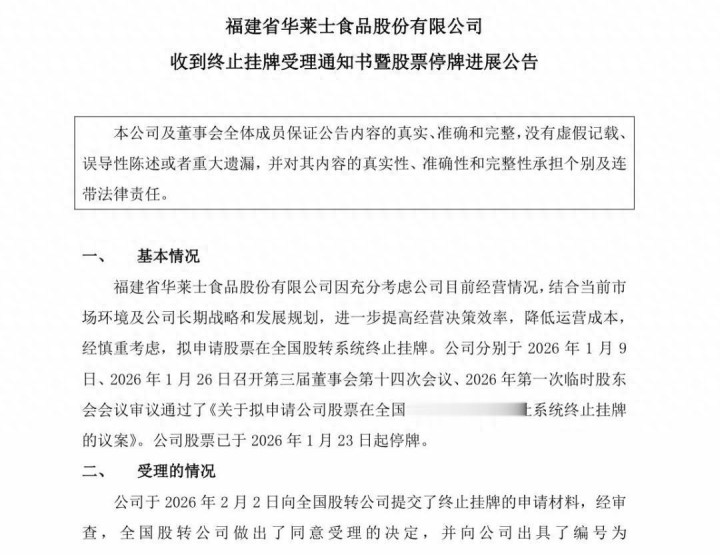 2月4日,华莱士的母公司华士食品正式宣布:我们要从新三板摘牌(退市)了。在大家的认知里,企业退市要么是快倒闭了,要么是财务造假被赶走,但华莱士偏偏属于第三种——它活得还挺滋润,却主动想躲进“阴影”里。