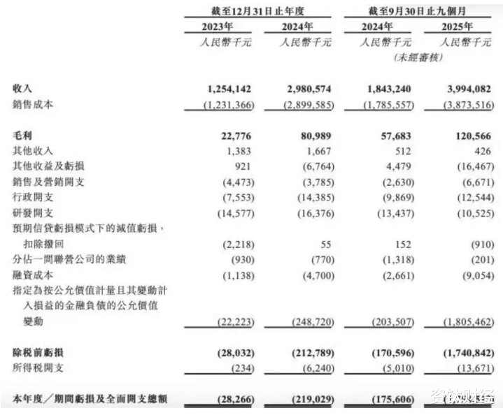 公司亏损规模加速恶化,已陷入严重财务困境。2023-2025年前三季度,按国际准则核算的净利润亏损额分别为0.28亿元、2.19亿元、17.55亿元,2025年三季度亏损较2024年同期扩大900%,累计亏损达22.78亿元。