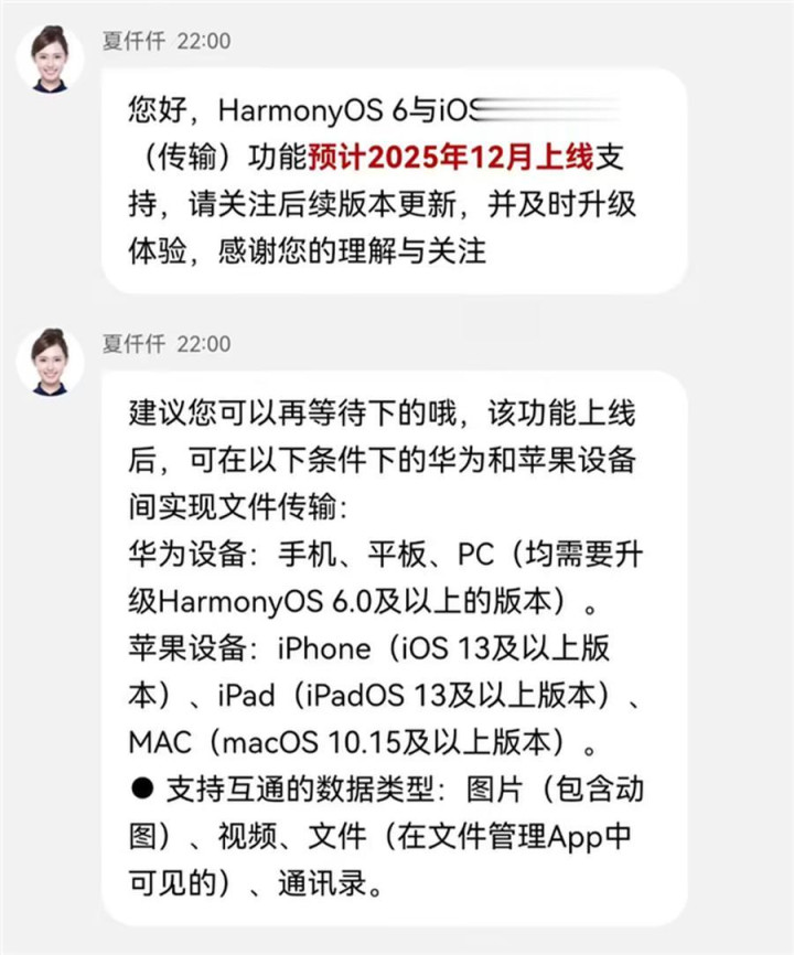 据华为官方客服介绍,HarmonyOS 6与iOS设备的数据互通功能将支持华为的手机、平板、PC设备金勺子,以及苹果的iPhone、iPad和Mac设备(需满足相应的操作系统版本要求)。用户可以通过鸿蒙星河互联App在设备间传输图片、视频、文件及通讯录等数据,极大提升了跨平台使用的便利性和效率。
