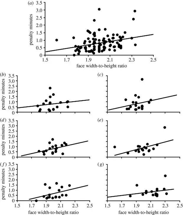 六支加拿大球队的男性职业曲棍球运动员的面部宽高比和攻击性行为之间的关系:(a)总体分析蓝乔配资,b-g单独球队分析,图源:参考文献 [3]