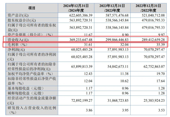 从招股书财务数据来看,公司营收虽呈增长趋势,但盈利能力稳定性不足。2022年至2024年,公司营业收入分别为2.89亿元、2.99亿元、3.69亿元,然而归母净利润波动显著,呈现“降后回升”格局。2022年至2024年,公司归母净利润分别为7007.03万元、5789.20万元、6802.55万元,2023年归母净利润同比下降17.38%,2024年同比增长17.50%,但两年间波动幅度超过34个百分点,盈利稳定性堪忧。