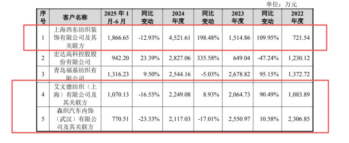 2025年上半年,公司前二十大客户销售收入较上年同期下降4.34%。具体来看,前五大客户中有三家降幅明显,第一名大客户上海西东纺织装饰有限公司及其关联方销售收入1866.65万元,同比下降12.93%;第四名大客户艾文德纺织(上海)有限公司及其关联方销售收入1070.13万元,同比下降16.55%;第五名大客户森织汽车内饰(武汉)有限公司及其关联方销售收入770.51万元,同比下降23.33%。更值得关注的是,2025年上半年,公司主要客户中有9家销售额同比降幅超30%,大客户收入下滑可能进一步放大公司业绩波动风险。